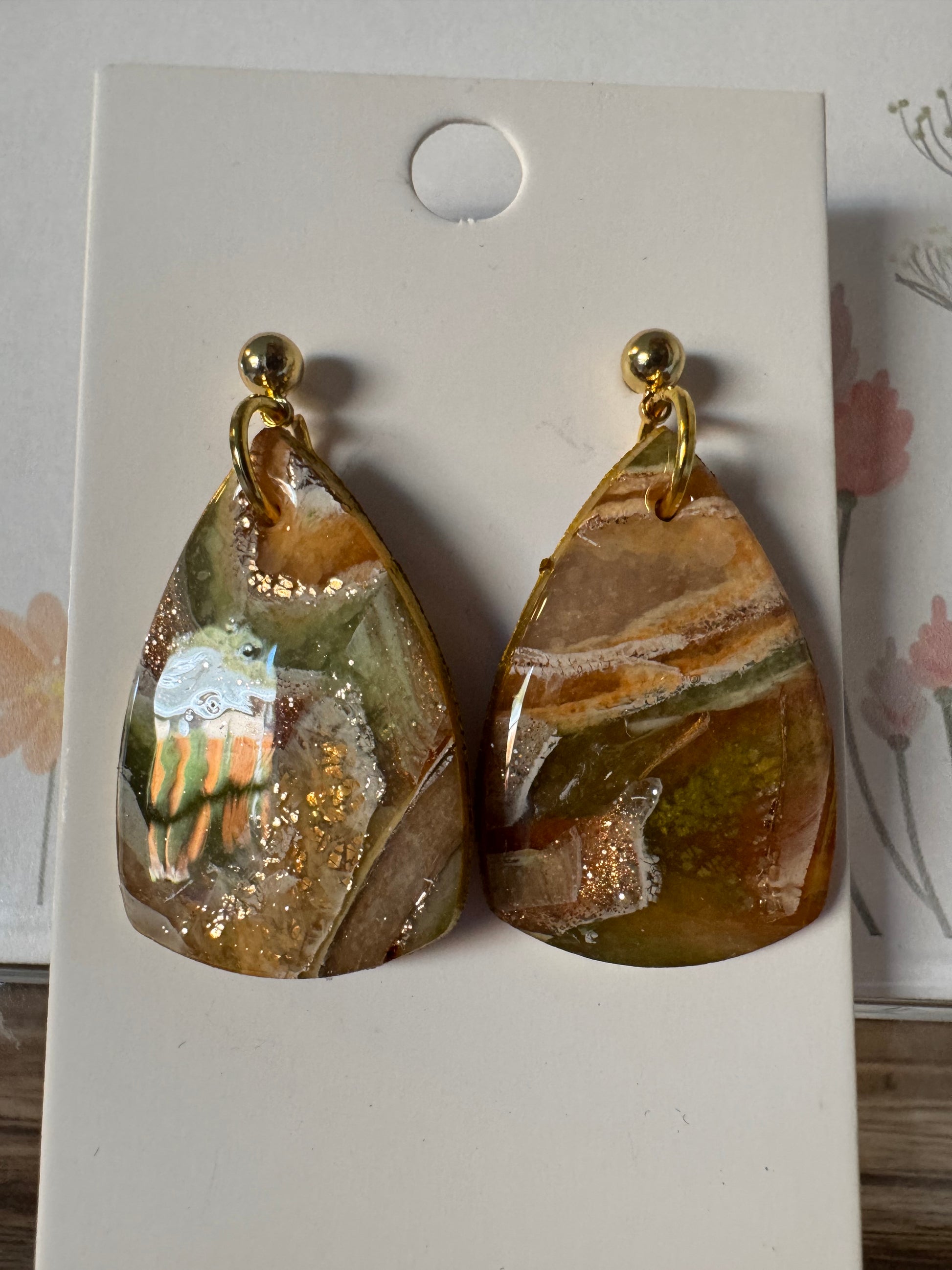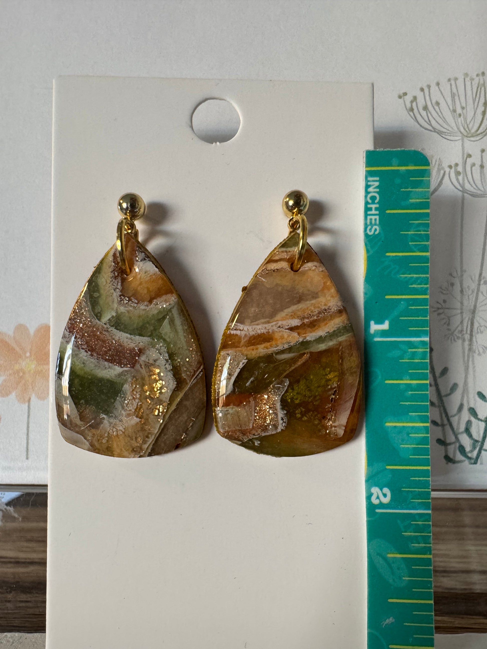 These earrings capture the essence of autumn with layers of earthy moss green, burnt orange, and warm amber. The subtle shimmer makes them the perfect accessory.